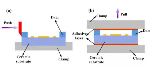 (2)焊線法:選用直徑為0.5mm或1.0mm的金屬線,通過焊料熔化直接焊接在基板金屬層上,隨后用拉力計沿垂直方向測量金屬線的拉脫力。